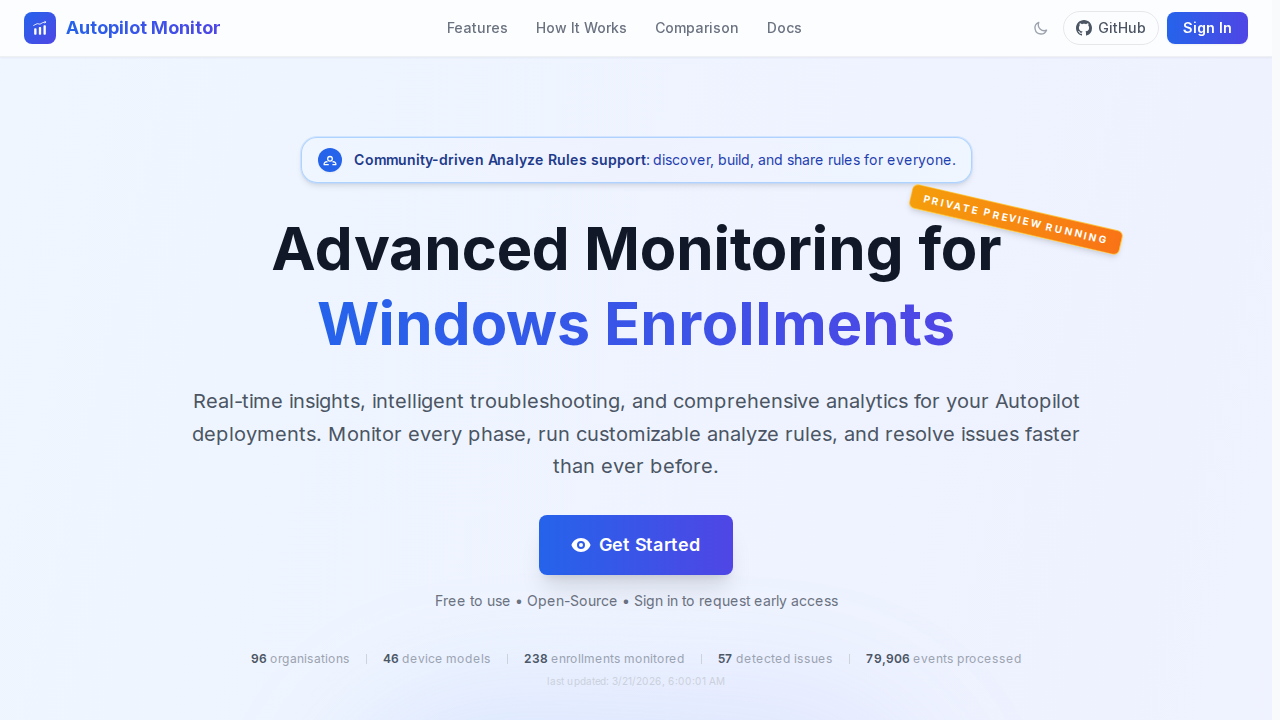 Autopilot Monitor provides real-time visibility into Windows Autopilot enrollments with live telemetry, intelligent diagnostics, and automated troubleshooting. It includes a bootstrap script deployed via Intune, a lightweight Monitoring Agent, a Backend API (Azure Functions), and a Next.js web dashboard for fleet analytics. It tracks enrollment phases, runs customizable analyze rules, collects diagnostics, and notifies teams to accelerate issue resolution.