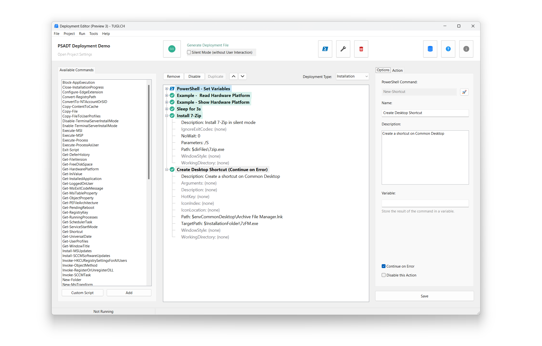 A visual software packaging editor for creating Windows deployment packages using PSAppDeployToolkit (PSADT). Build automated PowerShell deployment scripts through a GUI with drag-and-drop sequences, project templates, and one-click script generation for SCCM, Intune, WinGet, or task sequences.