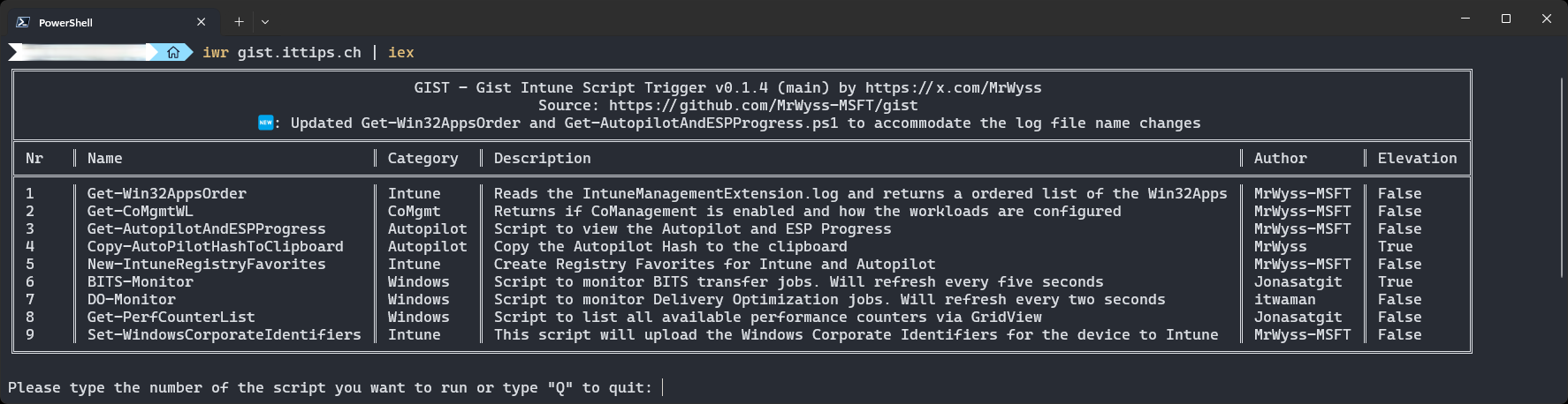 GIST - Gist Intune Script Trigger is a compact collection of PowerShell scripts for diagnosing and troubleshooting Intune devices. It features a menu-driven interface accessible via a simple one-liner (iwr gist.ittips.ch | iex) and supports direct gist IDs for quick runs. The scripts require no parameters, have no external dependencies, and prioritize safety by not altering system settings.