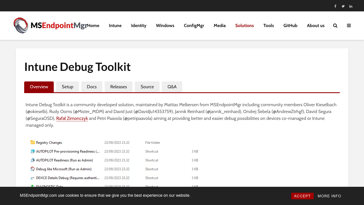 A comprehensive Windows-based toolbox for troubleshooting Intune-managed devices. Features registry debugging, Autopilot validation, live MDM event monitoring, SyncML visualization, Win32 app redeployment, IME log analysis, and includes IntuneDeviceDetailsGUI, SyncMLViewer, and CMTrace.