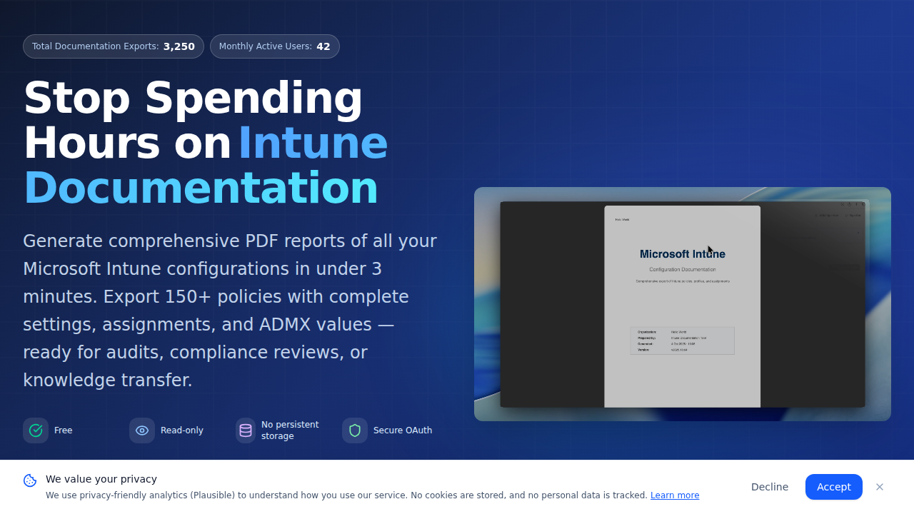 A free web application that generates comprehensive PDF documentation for Microsoft Intune configurations. Automatically exports all configuration types including device configurations, compliance policies, security baselines, PowerShell scripts, and Conditional Access Policies with full settings, assignments, and filters. Features customizable branding with logos, colors, headers, and footers. Uses read-only OAuth 2.0 authentication with no persistent data storage.