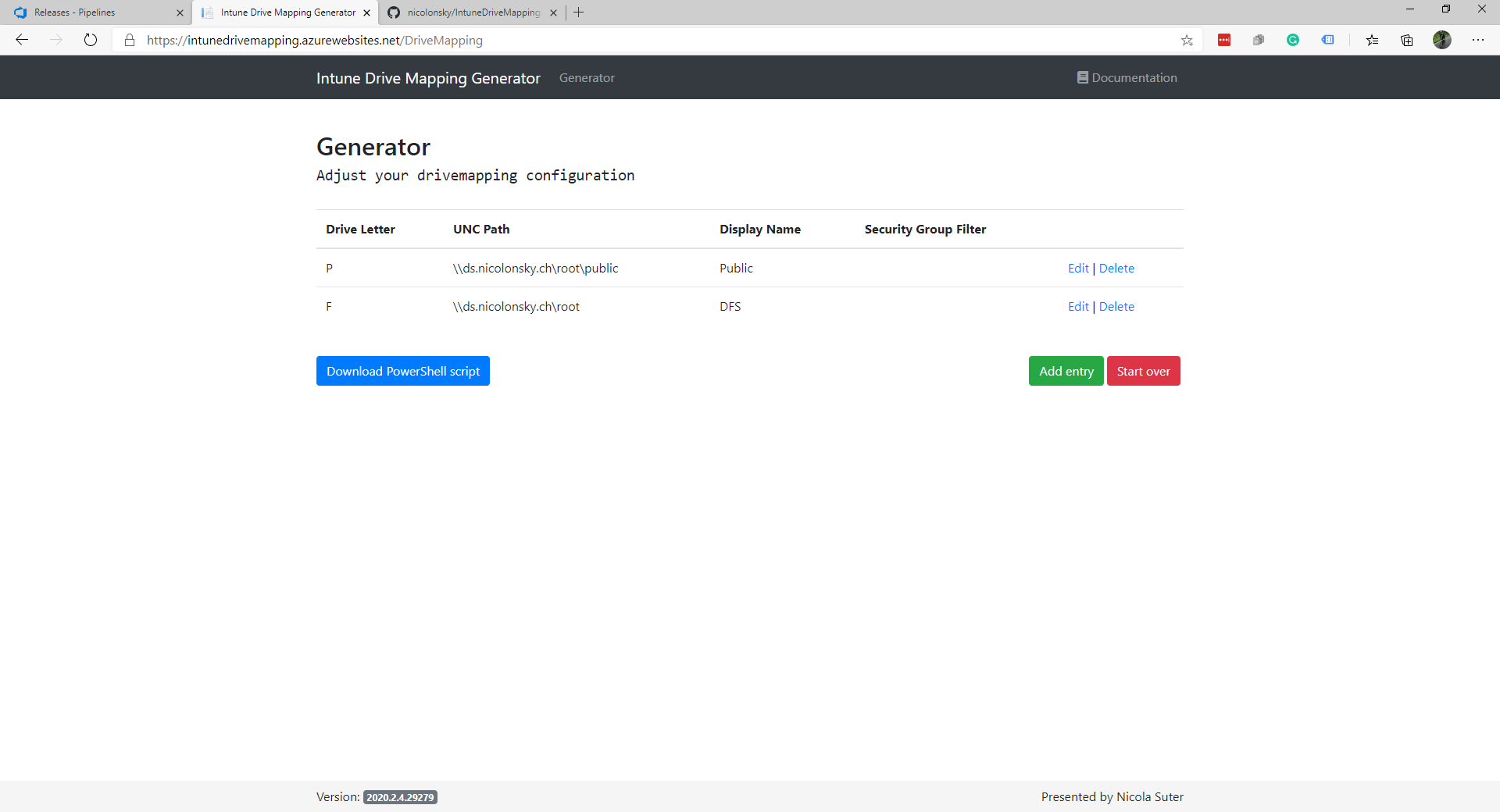 A web-based tool that generates PowerShell scripts for network drive mapping on Intune-managed Windows 10 devices. Converts existing Group Policy drive exports to Intune-compatible scripts, supports security group filtering with nested groups, and enables recurring execution.