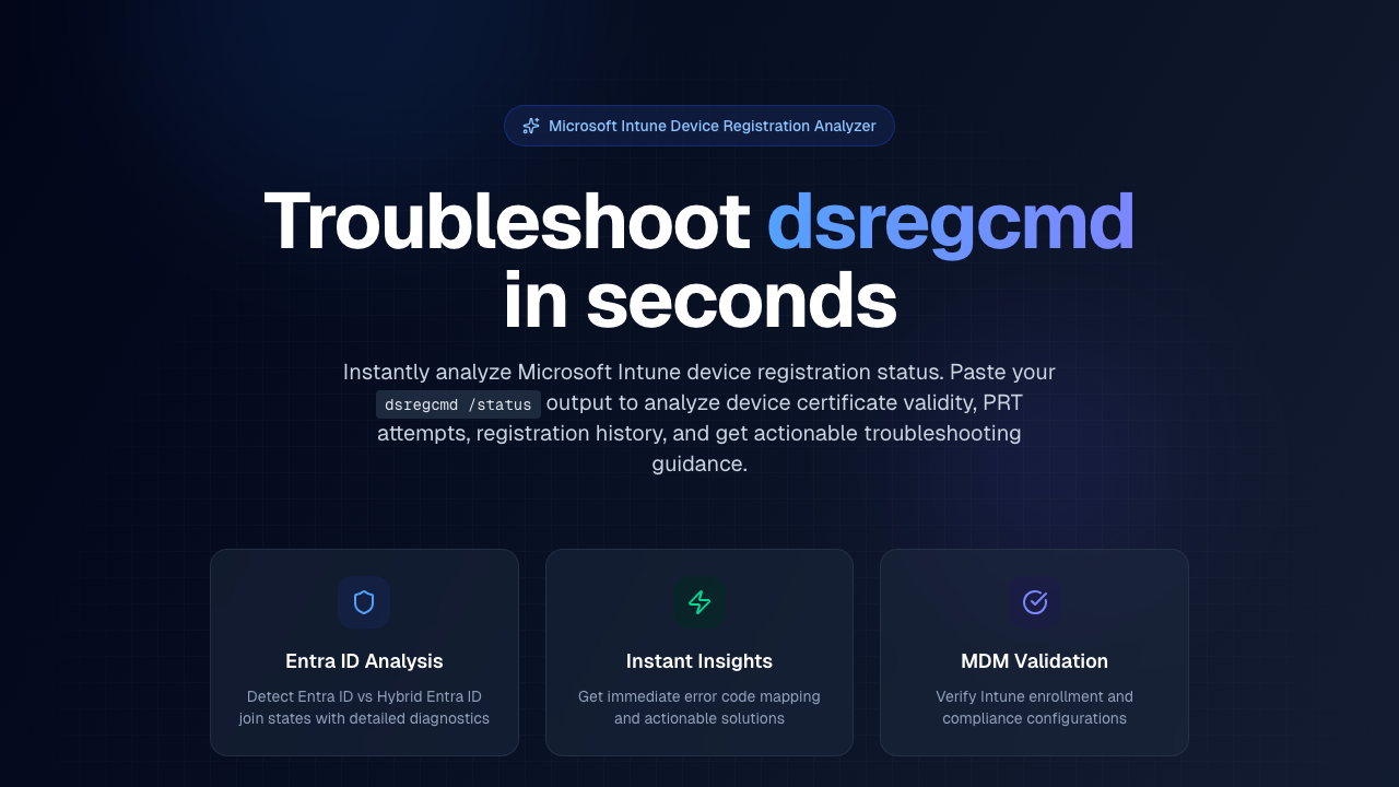 A web-based diagnostic tool for troubleshooting Microsoft Intune device registration issues. Analyzes dsregcmd /status output to detect Entra ID and Hybrid Entra ID join states, MDM enrollment status, and provides instant error code mapping with actionable solutions. All processing happens locally in the browser.