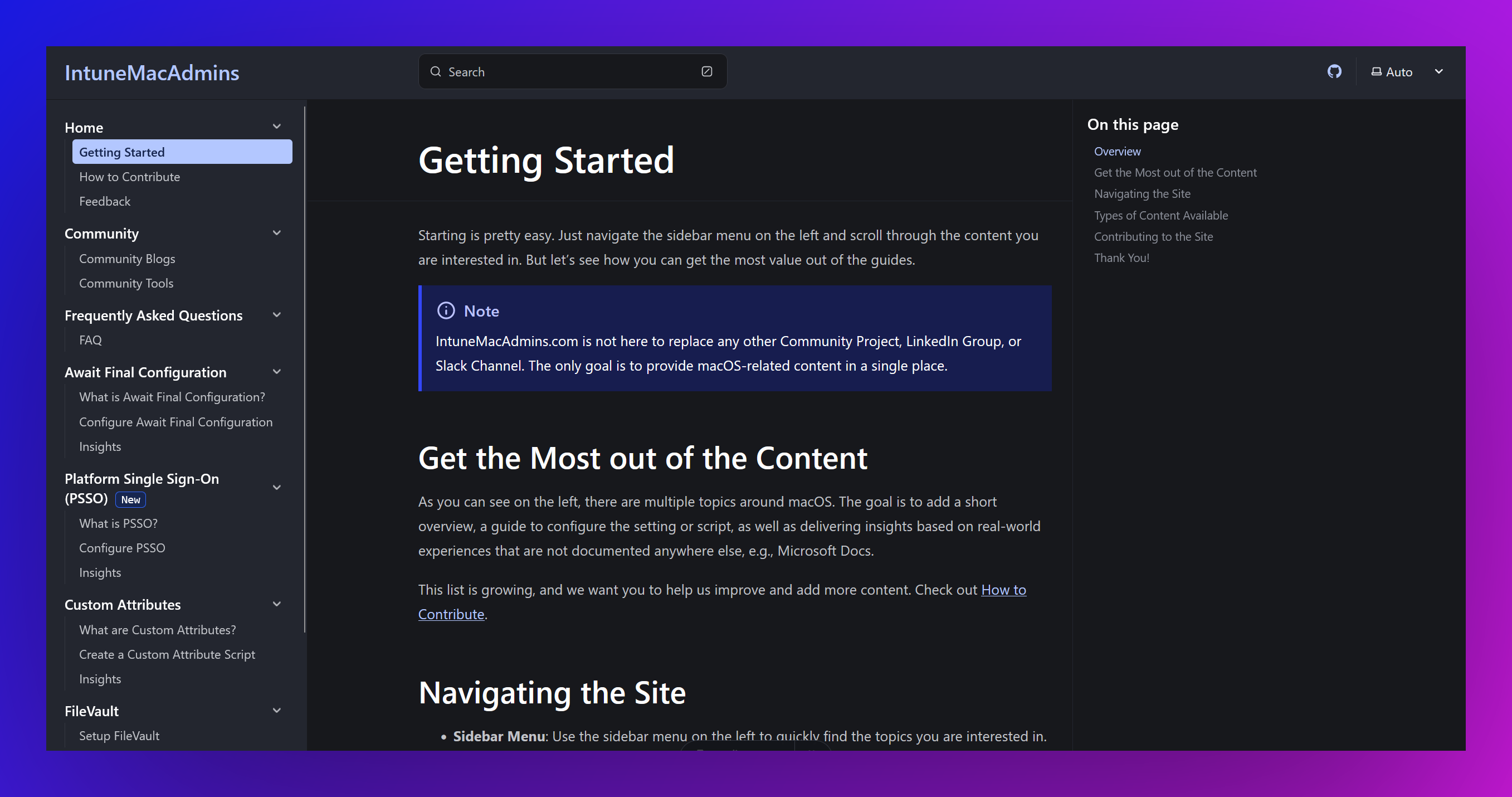 A community-driven documentation hub for macOS management within Microsoft Intune. Features guides, scripts, tools, and best practices contributed by IT professionals and Microsoft MVPs. Includes a Copilot assistant for macOS management queries and integration with the Open Intune Baseline (OIB) project for curated device management settings.