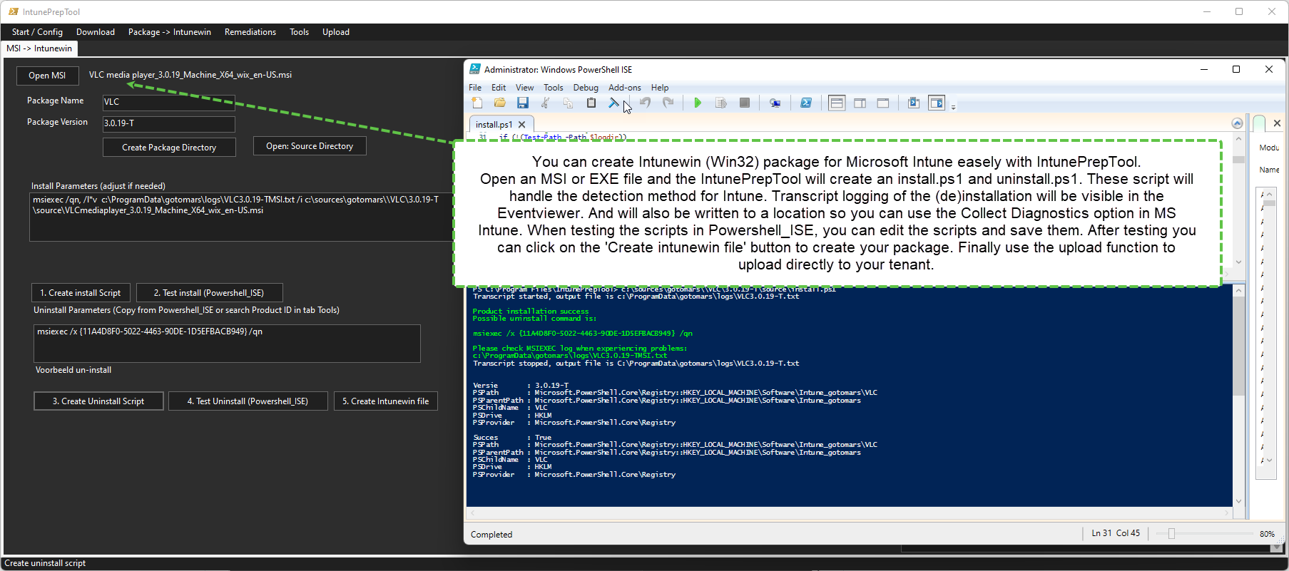 A PowerShell GUI tool for streamlining application packaging for Microsoft Intune. Supports MSI, MSIX, EXE, PowerShell scripts, Winget, Chocolatey, and scheduled tasks. Features automatic script generation, direct Intune upload, registry modifications, shortcuts, and AI-assisted configuration via Azure OpenAI GPT-4.