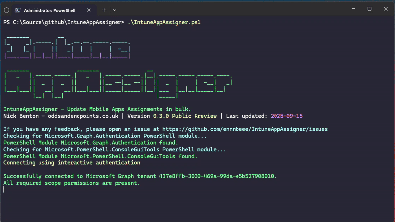 IntuneAppAssigner is a PowerShell tool that enables bulk assignment of mobile apps in Microsoft Intune. It provides an interactive interface to select apps, choose assignment mode (replace, add, or review), set installation intent (Required, Available, Uninstall), and pick target groups (All users, All devices, or Entra ID groups). It also supports assignment filters and, for Android/iOS, App Config profiles (COPE/BYOD). Public Preview status is noted.