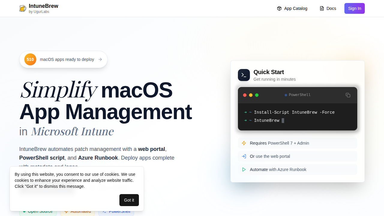 A macOS app deployment and patch management solution for Microsoft Intune. Features a web portal for app management, PowerShell script automation, and Azure Runbook integration for scheduled updates. Supports 510+ macOS applications with automated version comparison, intelligent patch management, and robust error handling with automatic retry mechanisms. Includes certificate-based and interactive authentication options.