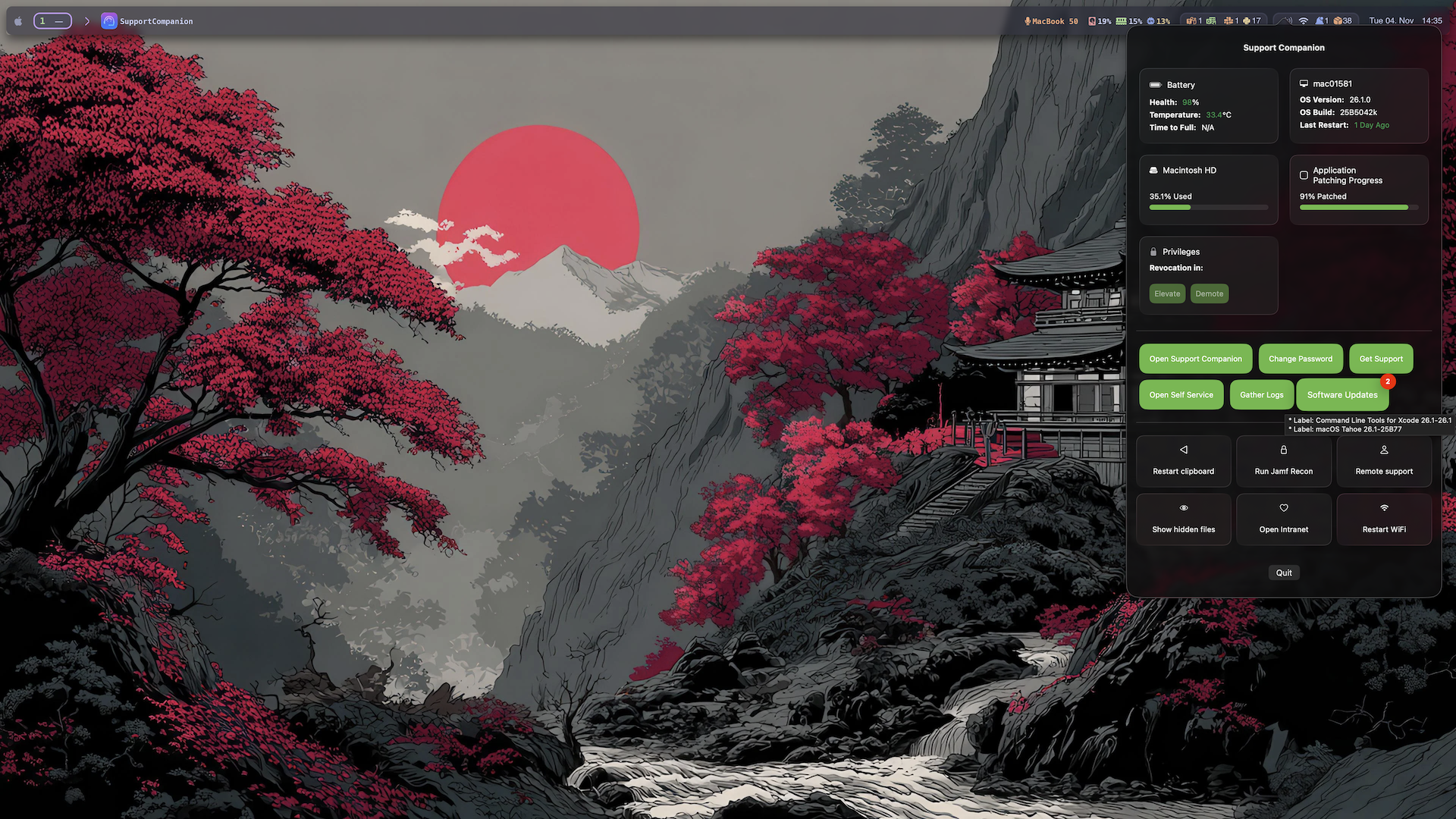 A macOS helper application designed to empower end-users by providing quick access to crucial information and actions. Features a tray menu, dashboard, user identity info, installed apps list, self-service capabilities, knowledge base access, and Company Portal integration.